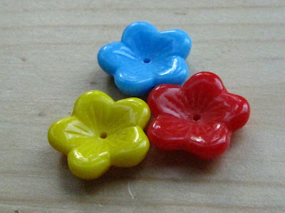 My final purchase at the Bead Box was a set of three Czech pressed glass flower beads. The colors are so happy and bright (photo below)! Did you notice that all the beads I bought were more or less flat? There is a reason for that, but you will have to wait until my next post to find out what it is!